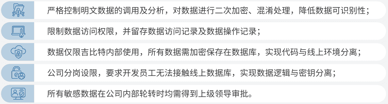公司对用户个人信息实施脱敏处理,,,严格限制用户信息用途,,,数据使用完成后集中归档处理。。为进一步确保数据处理过程的安全,,,,公司根据实际的业务工作分岗设限,,,,最大程度保护数据隐私安全,,,,如在生产网络中的加密数据由研发部门员工负责编写加、、、解密程序,,,但其无法直接访问到加密后的数据库;程序的加、、解密密钥由运维员工单独配置。。。。