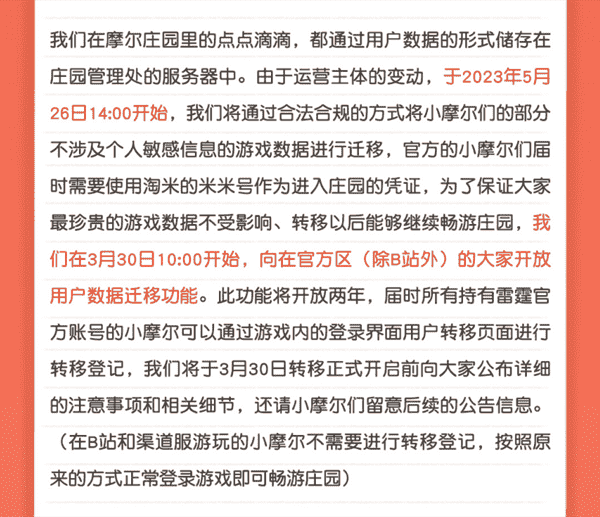 合作结束本就是开发方和代理方双方的事情,,降低这件事情对玩家的影响,,,,才是对所有珍视这段童年的摩尔玩家最好的呵护。。。目前看来,,,用户完全不用担心后续因无法登录游戏而造成任何数据上的损失,,只要及时进行账号转移,,,就可以好好保留、、、、延续在庄园的痕迹和回忆,,,继续在庄园里做快乐的红鼻子小鼹鼠。。。