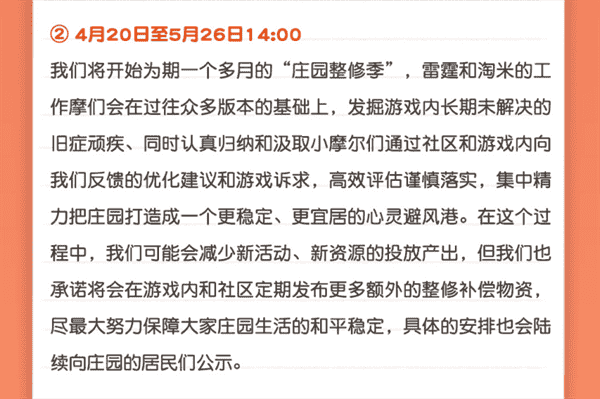 合作的结束并不意味着这个童年IP的结束,,,对于《摩尔庄园》手游而言,,这是一个新阶段的开始。。。。后续游戏内将开启庄园重构计划,,,,会就以往遗留下来的BUG进行集中修复,,,并在游戏内和社区定期发布更多补偿物资。。