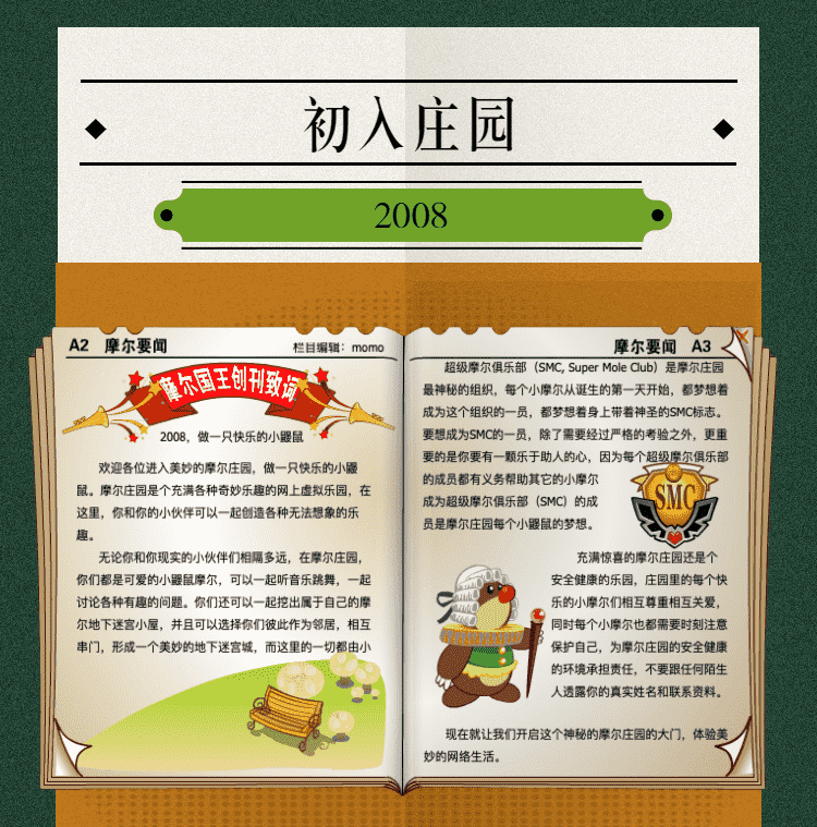在这一年,,,,摩尔庄园诞生了。。。。在这里,,,大家都是可爱的红鼻子鼹鼠小摩尔,,可以一起勤劳耕作,,,一起高山滑雪......我们都是摩尔庄园的建设者。。