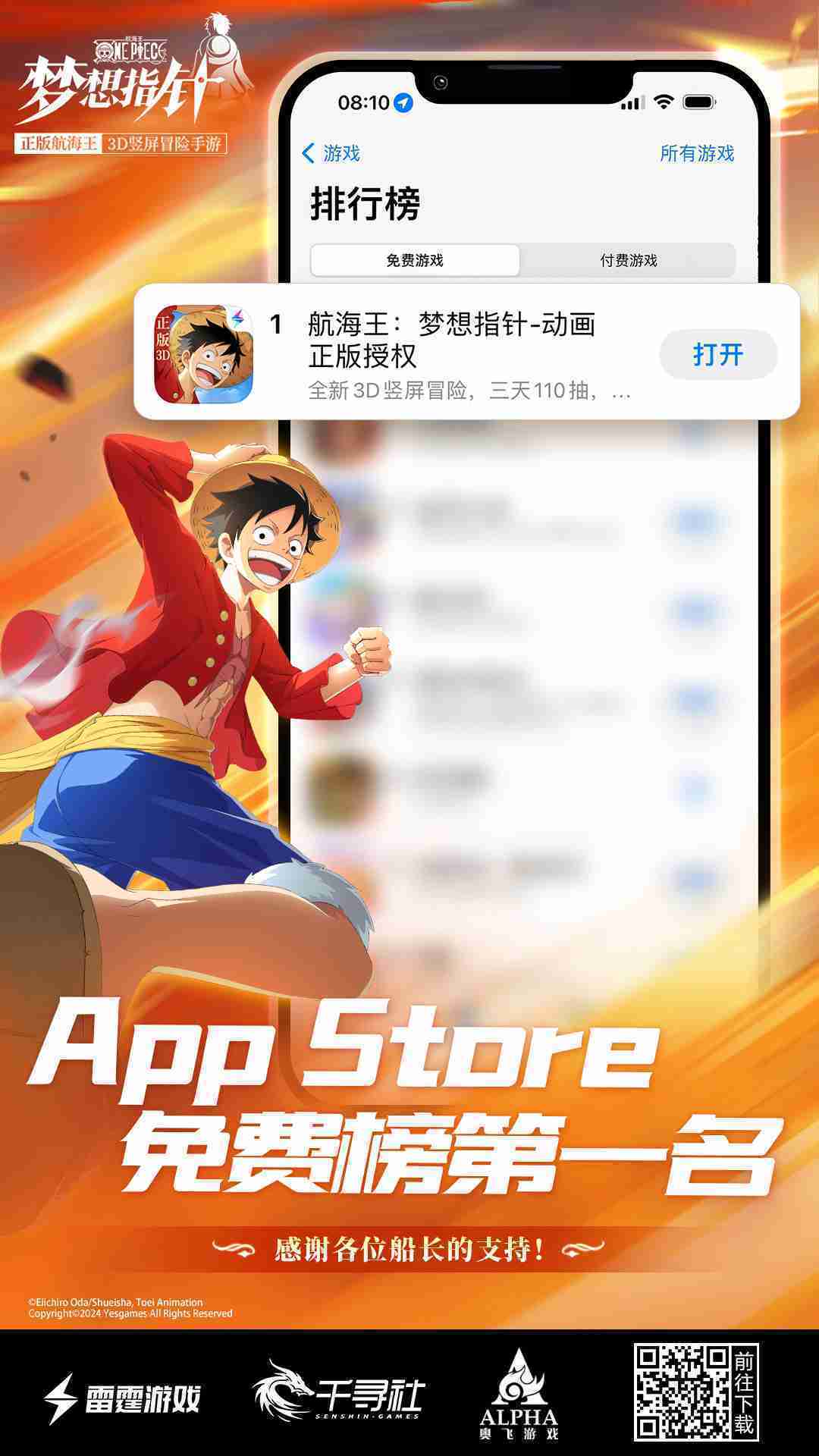 《航海王::::梦想指针》登顶App Store免费榜,,,公测福利汇总!!!!