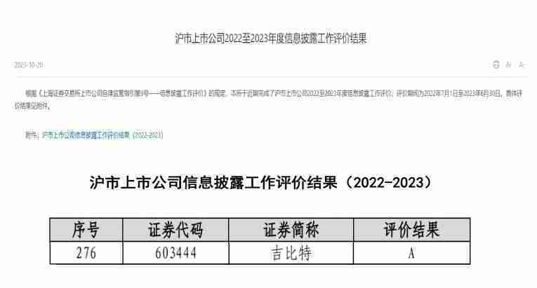 近日,,上海证券交易所发布2022-2023年度信息披露工作评价结果。。J9.COM(股票代码:::603444)凭借规范的公司治理、、、、高质量的信息披露以及良好的投资者关系管理再次荣获信息披露工作A级评价,,公司连续两年获此殊荣。。。。